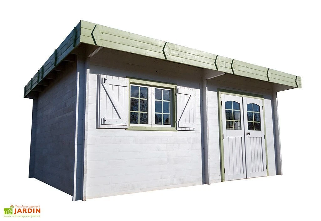 L’abri est constitué de madriers emboités de 42 mm d’épaisseur à double rainurage. La surface intérieure de 17,47 m² vous permet, dans la plupart des communes, d’installer votre abri sans demander de permis de construire. Il dispose d’un toit plat en bac acier (pente de 2°), d’une grande double porte battante de 140 x 180 cm (l,h) et de 2 fenêtres ouvrantes de 78 x 48,5 cm (l,h) avec volets.