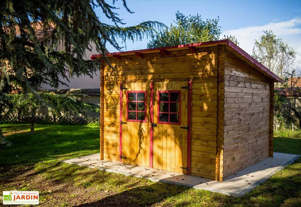 L’abri de jardin est en épicéa massif brut et les parois possèdent une épaisseur de 28 mm. Les madriers sont à emboiter pour un montage facile. Il est équipé d’une double porte de 160 cm de largeur et de 169 cm de hauteur. Chaque porte est équipée d’une lucarne de 50 cm de largeur et de 60 cm de hauteur. Le bois utilisé pour la confection de l’abri est certifié PEFC. Il est livré brut, prêt à être traité et lasuré.