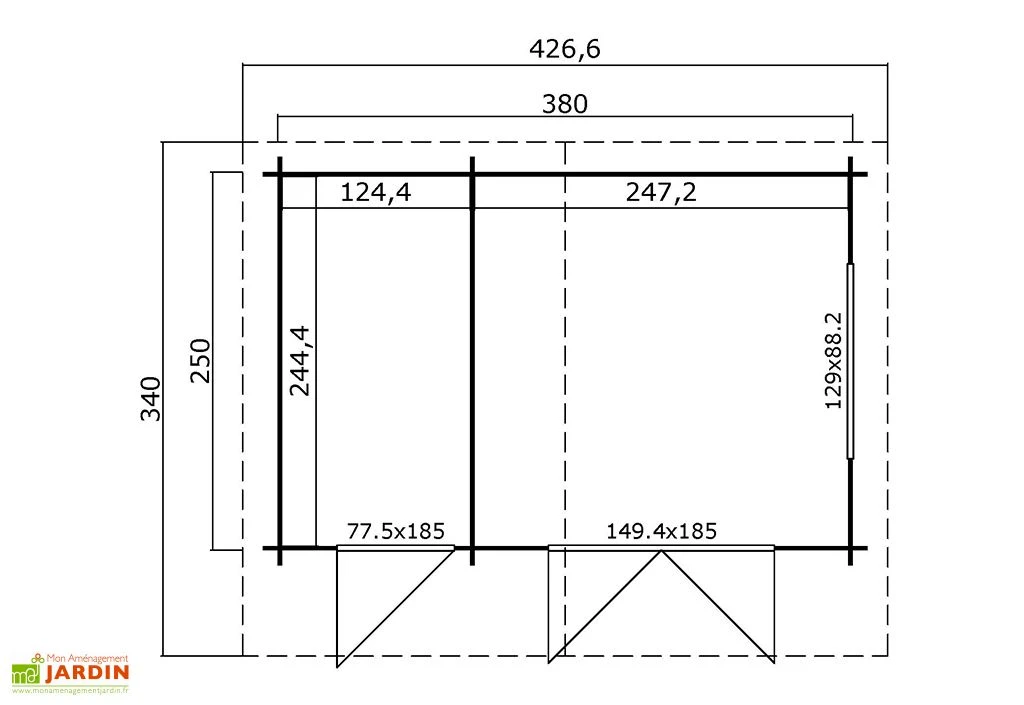 - Dimensions hors tout : 340 x 426,6 cm – 14,5 m²