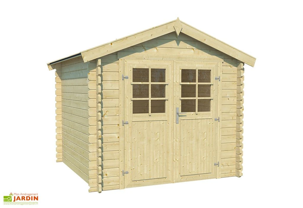 Cet abri de jardin en bois est doté de parois constituées de madriers de 34 mm d’épaisseur. Ces solides cloisons intègrent une double porte vitrée (simple vitrage) de 149,4 x 173,6 cm. Une toiture à deux pans avec revêtement en feutre bitumeux surmonte le tout.