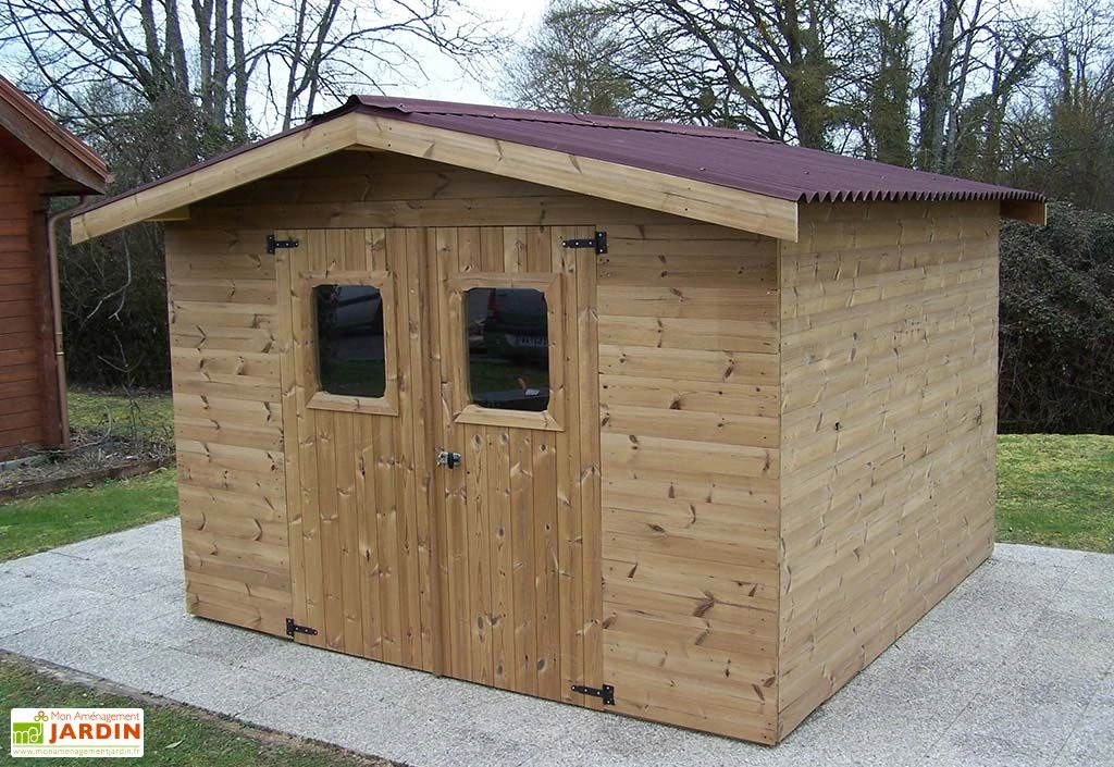 Bien conçue, cette cabane de jardin en bois est équipée d’une double porte vitrée de 160 x 182 cm. Vous pourrez donc accéder facilement à l’intérieur de l’abri, et ce même avec du matériel ou des objets relativement encombrants, si vous utilisez la cabane en tant qu’abri pour vos poubelles par exemple. Son espace intérieur de 8,76 m² vous permettra de ranger du matériel de jardinage, des outils ou du petit mobilier de jardin en toute simplicité, et l’abri occupera une surface de 8,97 m² dans votre jardin. Grâce à la présence d’une toiture à deux pans recouverte de plaques ondulées bitumées, le contenu de l’abri demeurera bien au sec.