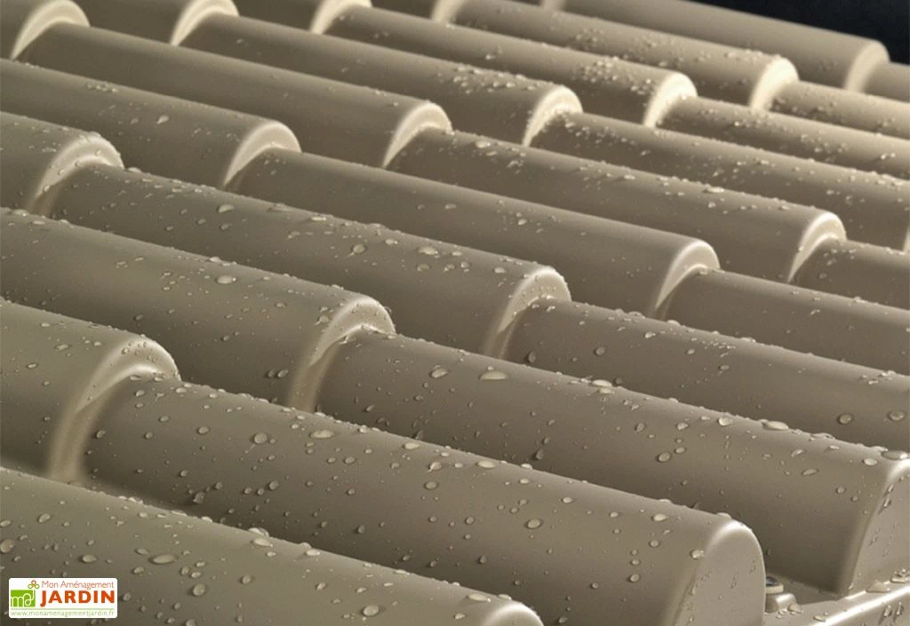L’abri de jardin est livrĂ© avec son plancher en dalles de bois composite, d’une Ă©paisseur de 4,5 cm. La toiture en ABS (plastique rĂ©sistant) possède 2 pans. Elle est traitĂ©e anti-UV pour Ă©viter la dĂ©coloration et imite les tuiles pour un rendu esthĂ©tique.Â