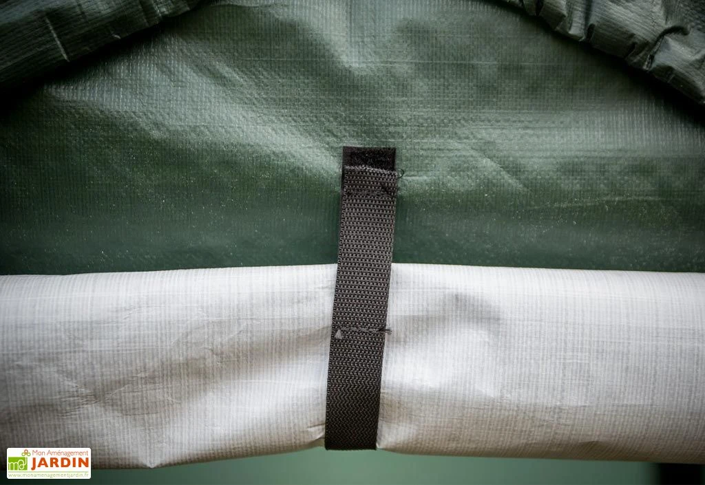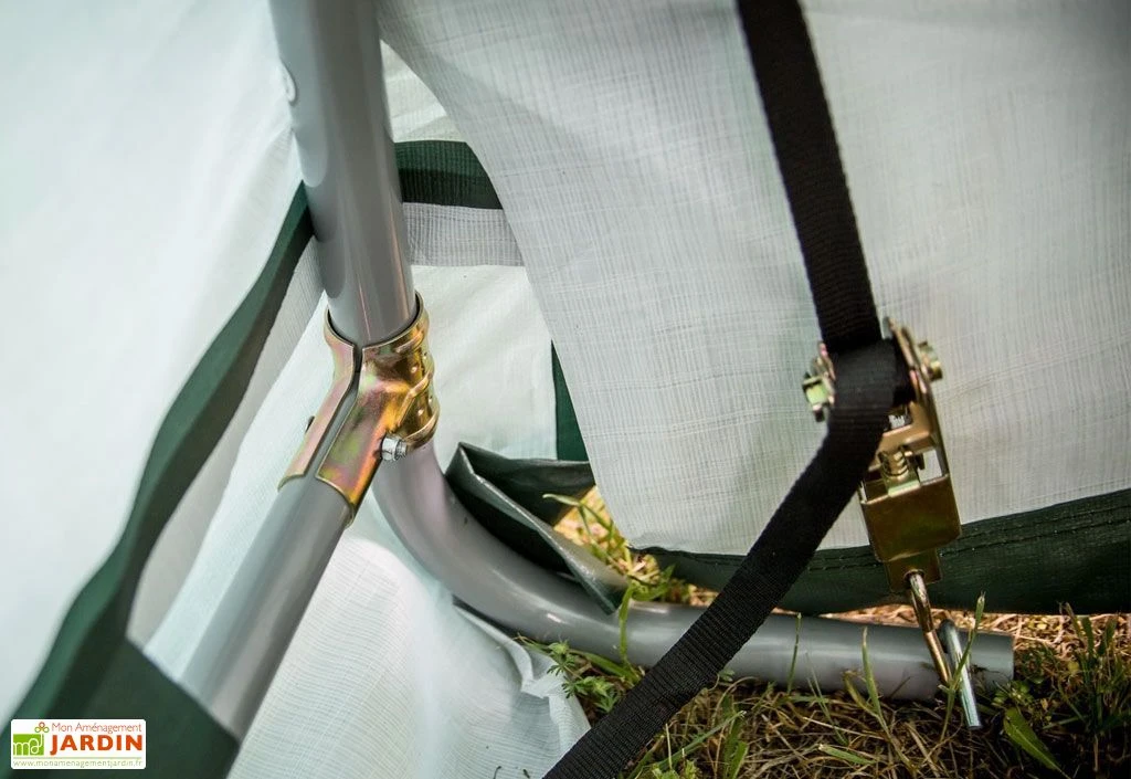 L’abri en toile est livré avec son kit d’ancrage pour la fixation au sol. L’assemblage est simple et rapide grâce à son système ingénieux de clipsage. L’intérieur de la tonnelle est blanc pour la luminosité, et l’extérieur vert foncé afin de se confondre avec l’environnement.