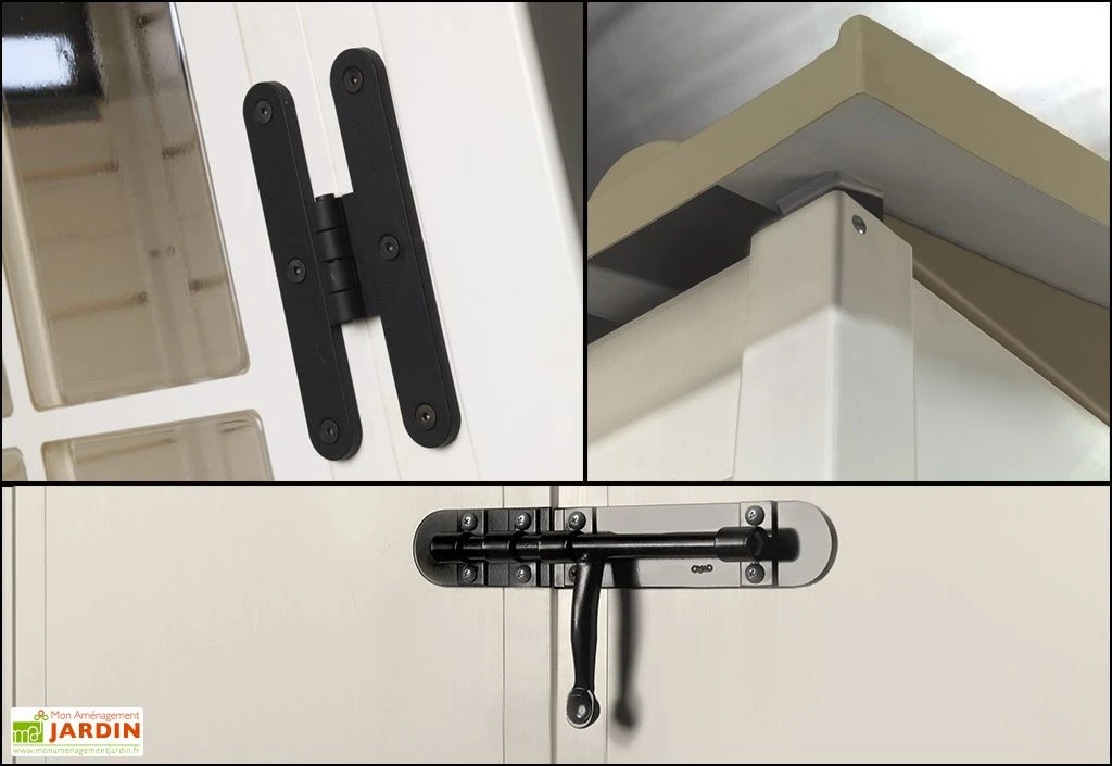 L’abri de jardin possède des parois en PVC de 20 mm d’épaisseur et une toiture en ABS (plastique résistant aux chocs) monobloc et traité anti-UV. Le toit possède une légère pente.