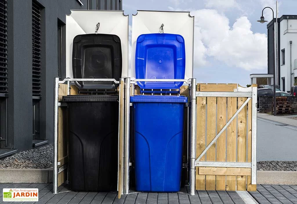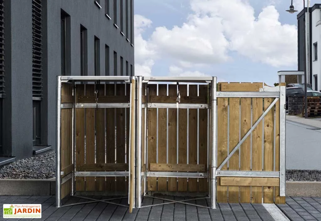 Ce cache-poubelle double signé Hide affiche des dimensions de 120,8 x 63,4 cm pour une hauteur de 115,2 cm, ce qui lui permet d’accueillir deux bennes de 140 L chacune. Il vous est proposé dans deux finitions différentes, bois naturel ou gris clair, ce qui devrait faciliter son intégration dans votre extérieur. Ses portes frontales et couvercles vous permettront de plus de remplir et sortir vos poubelles en toute simplicité.