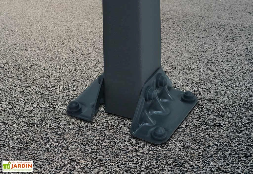 Ce grand carport est doté d’une solide structure en aluminium (de 2mm d’épaisseur sur les poteaux) gris anthracite RAL 7016 avec connexions en acier galvanisé. Cette structure supporte une couverture faite de panneaux en polycarbonate semi-transparent de 6 mm d’épaisseur, conçus pour filtrer 100% des rayons UV. Ils ne jauniront donc pas et protègeront efficacement vos véhicules.