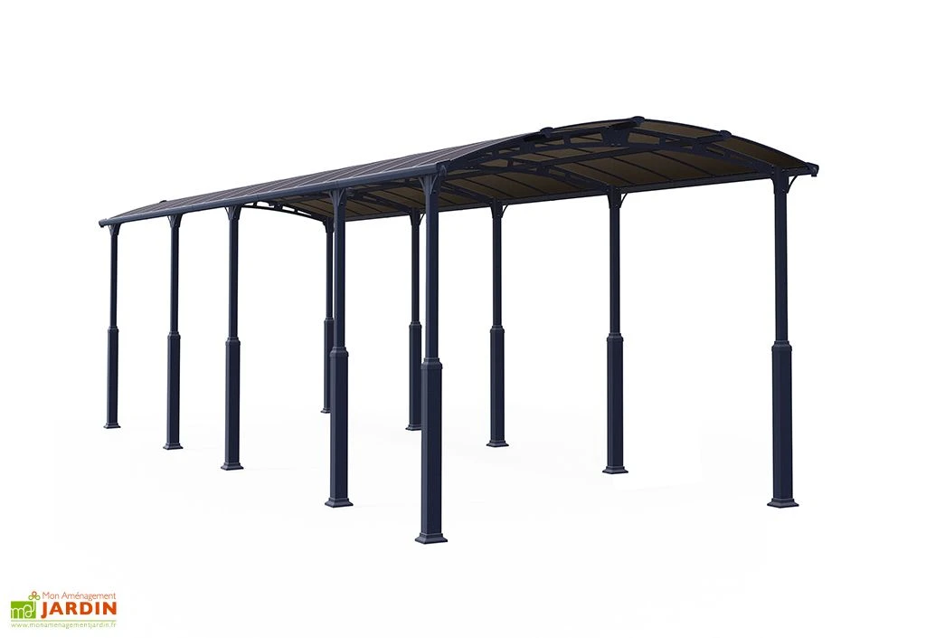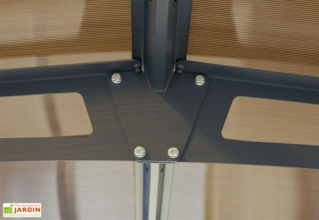 Livré en kit, ce grand carport devra être monté et installé par vos soins. Sa solide structure en aluminium gris anthracite RAL 7016 dispose de raccords en acier galvanisé et accueille une couverture composée de panneaux en polycarbonate semi-transparent de 6 mm d’épaisseur. Ces panneaux sont conçus pour filtrer 100% des rayons UV, le tout sans jamais jaunir ou décolorer.