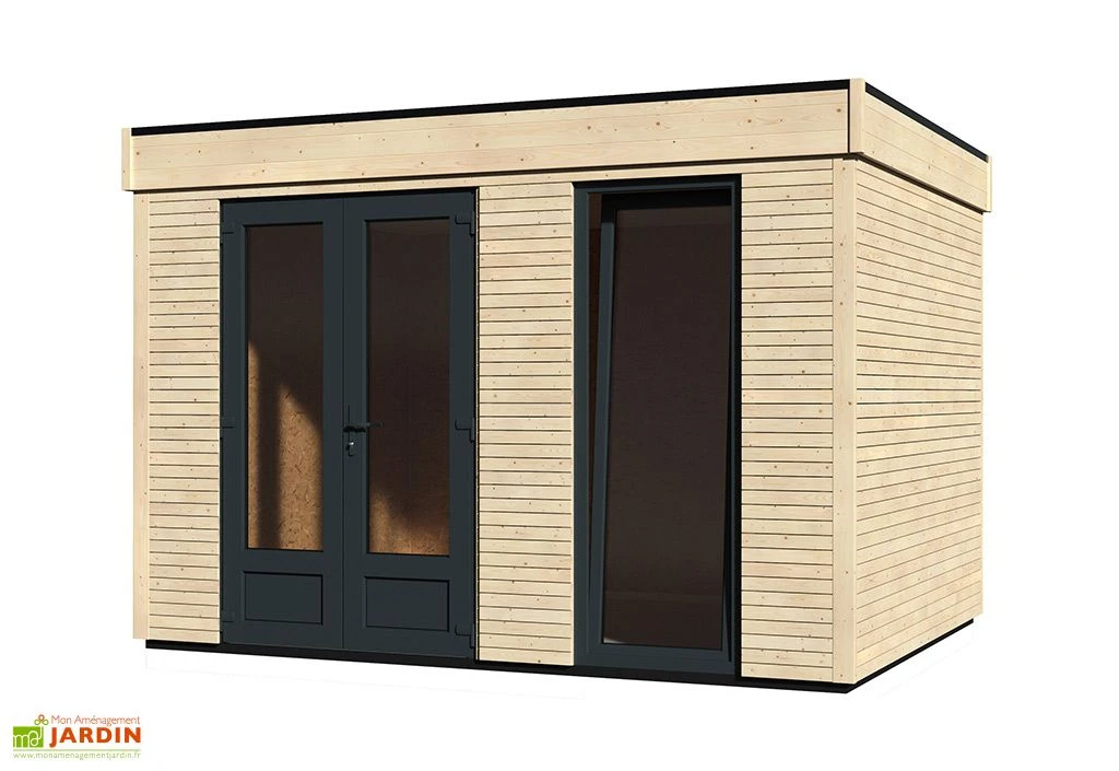 L’abri en bois dispose d’une porte de 140 x 215 cm (l,h) en PVC gris anthracite avec un double vitrage 4/16/4 mm et une serrure à barillet. La fenêtre battante tirant à gauche mesure 80 x 215 cm (l,h). Elle est en PVC gris anthracite et double vitrage également.