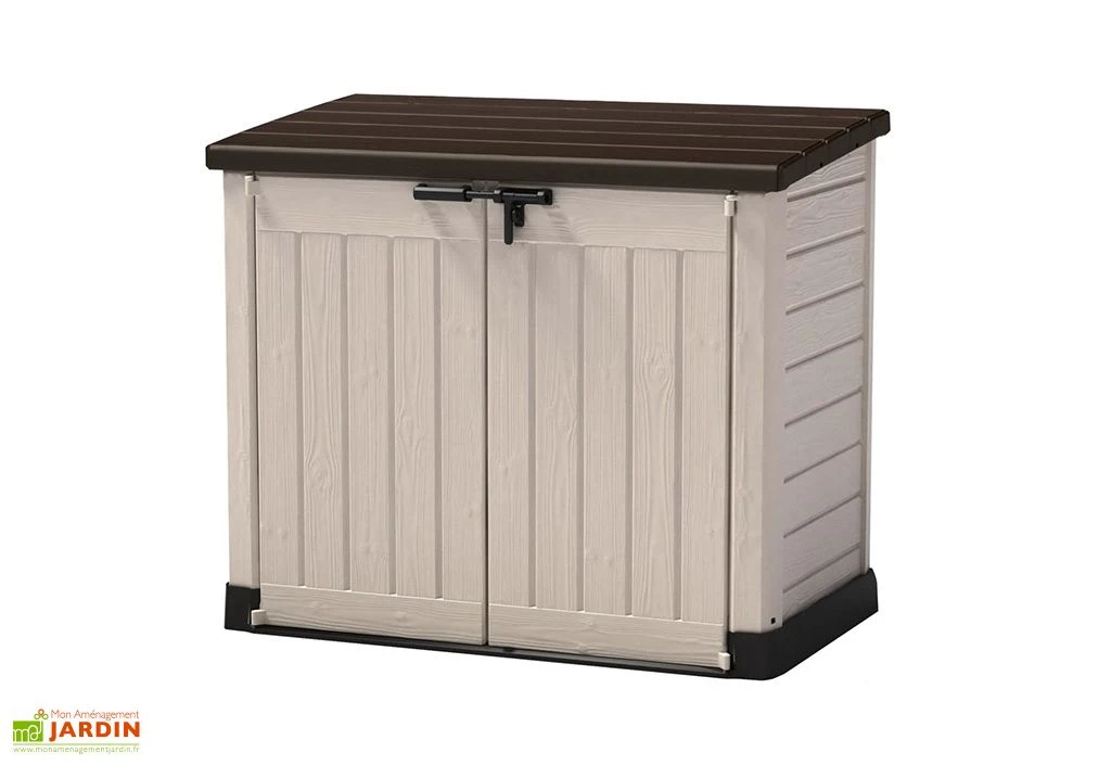 Entièrement fabriqué en résine, ce coffre de rangement extérieur ne vous demandera aucun entretien particulier. Ses dimensions au sol de 143 x 82 cm (largeur x profondeur) lui permettent de n’occuper que peu d’espace dans votre jardin (1,2 m²) mais il vous offrira tout de même un espace de rangement de 1200 L. Très bien pensé, ce coffre d’extérieur est doté d’un couvercle équipé de vérins, d’une double porte frontale et d’un plancher. Il vous sera livré en kit et devra être monté par vos soins.