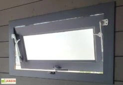 Il s’agit d’une fenêtre de 90 x 51 cm qui dispose d’une structure en aluminium et d’une vitre en double vitrage. La fenêtre bénéficie d’une ouverture battante. La vitre mesure 61 x 22 cm (l,h) et l’ouvrant mesure 79 x 39,5 cm (l,h).