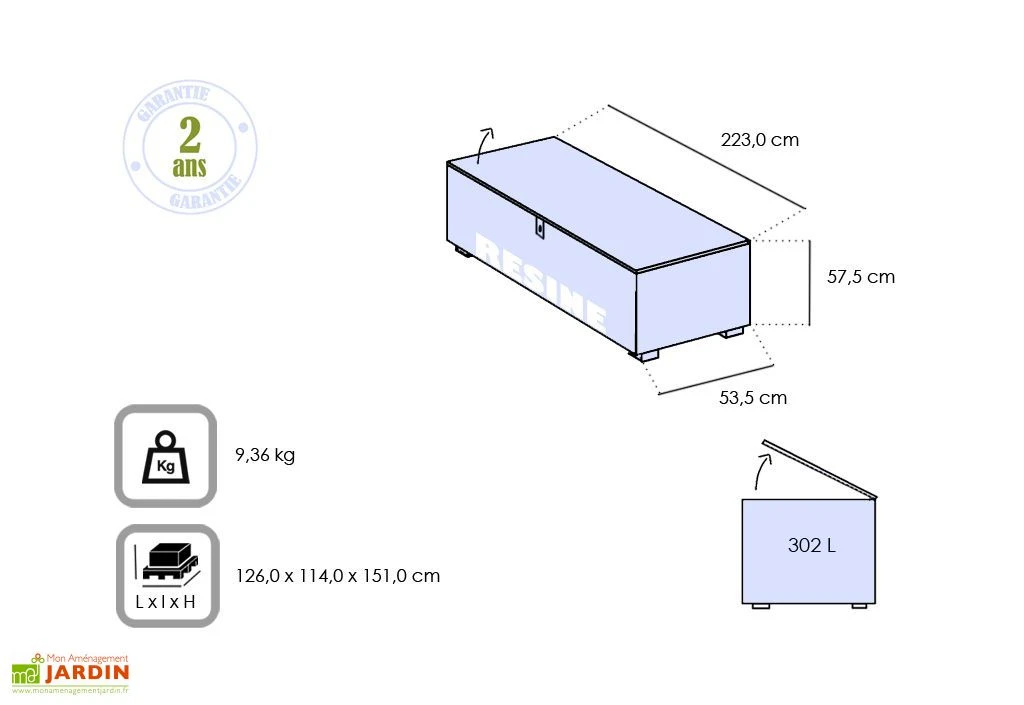 Le coffre de 302 L vous permet de ranger vos outils ou équipements de jardin. Il permet également à deux adultes de s’assoir en servant de banc.