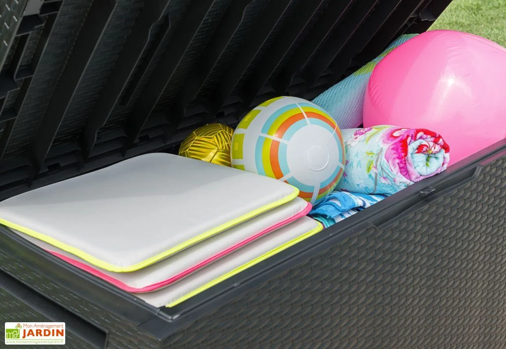 La résine ne craint pas les intempéries, le coffre peut donc rester dehors sans moisir ni prendre l’eau. Il conserve le contenu sec et aéré.