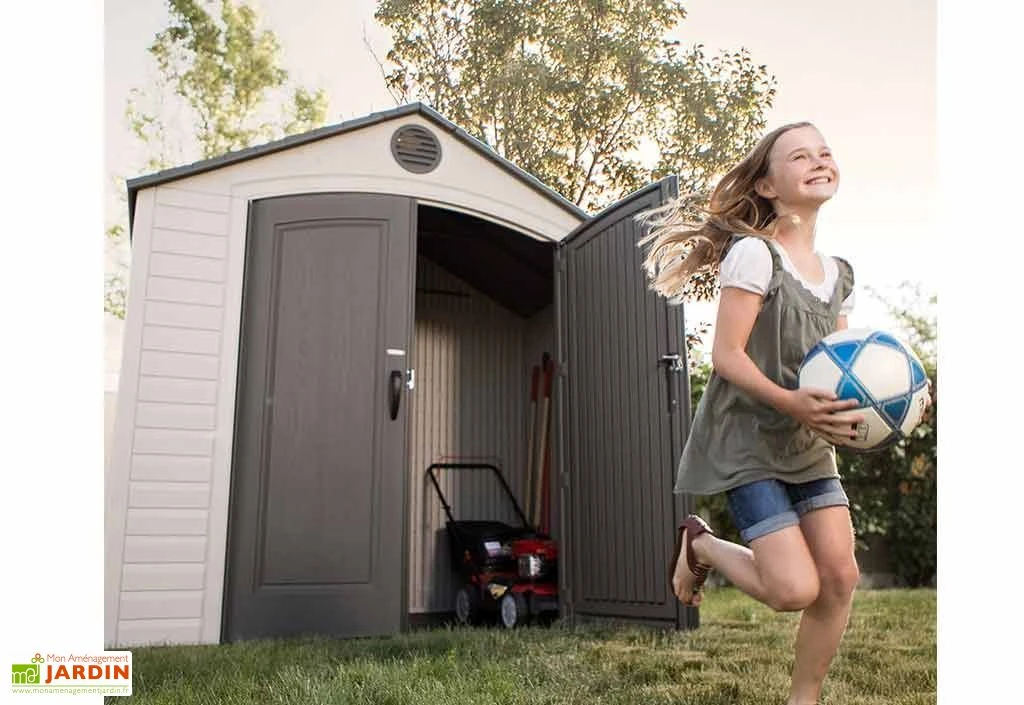 Votre abri de jardin en résine beige et amande de chez Lifetime est un produit de haute qualité avec sa double paroi en polyéthylène haute densité (HDPE) de 23 mm d’épaisseur. Le toit est en double paroi HDPE également et possède une pente de 50%.