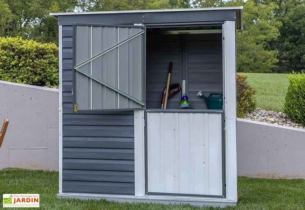 Bien conçue, cette cabane de jardin en métal s’est vue dotée d’une porte de 76 x 175 cm (largeur x hauteur) pensée pour être ouverte en deux parties afin de vous permettre de pénétrer facilement en son sein (porte totalement ouverte) ou d’assurer la bonne ventilation de l’intérieur (porte semi-ouverte) pour éviter le développement de moisissures par exemple.